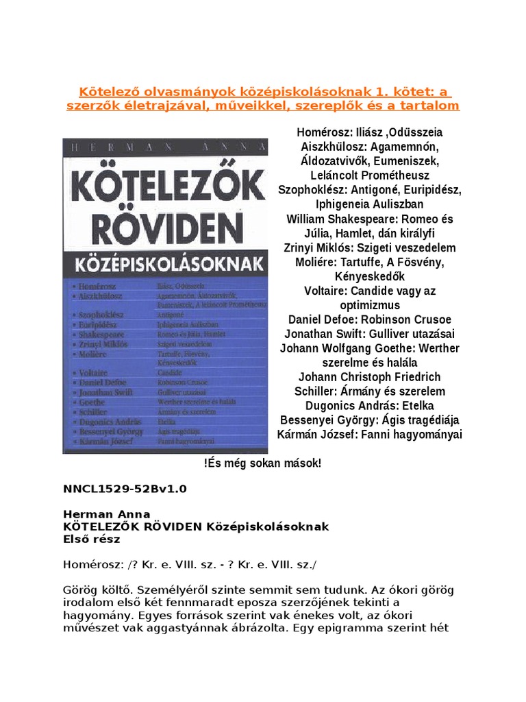 Kotelezok Roviden Kozepiskolasoknak 1 Konyv Herman Anna Rukkola Hu