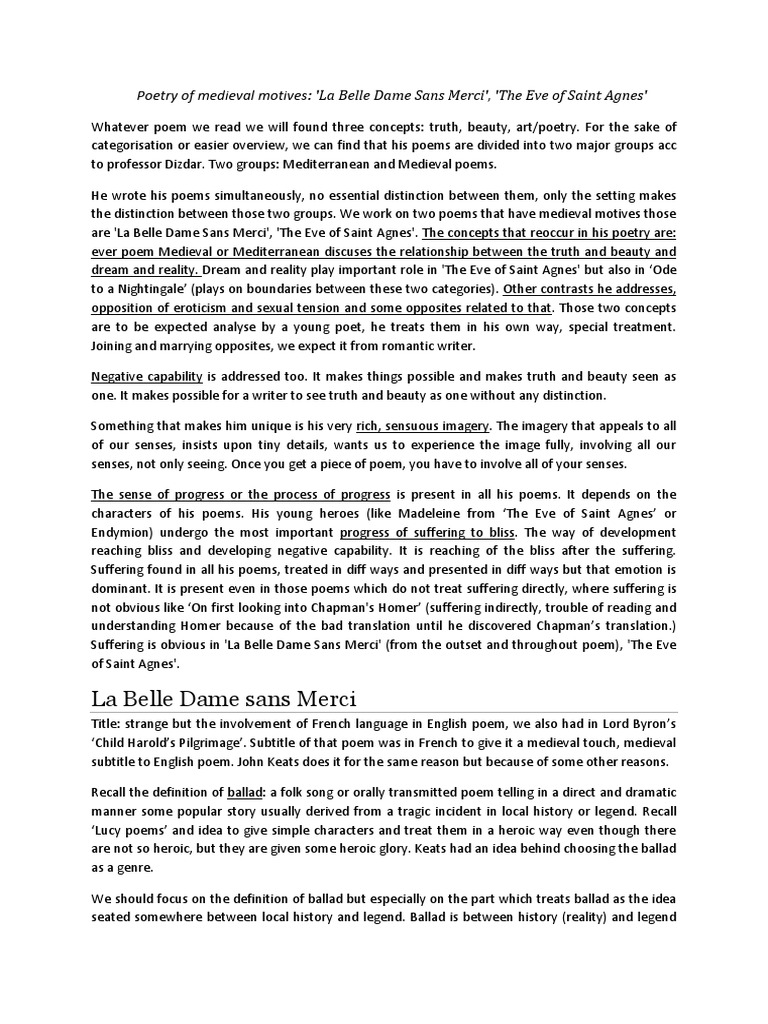 La Belle Dame Sans Merci Summary Analysis By John Keats English Summary