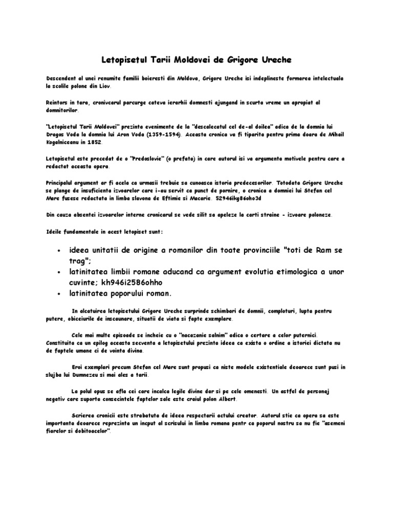 Rezumat Letopisetul Tarii Moldovei De Grigore Ureche