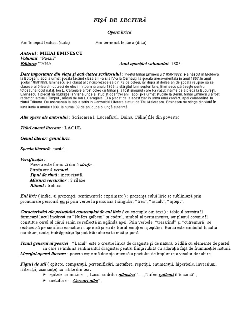 Fisa De Lectura Mihai Eminescu Lacul