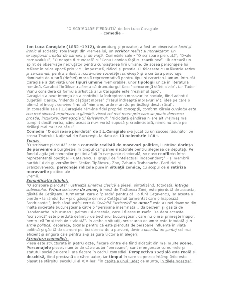 Doc O Scrisoare Pierduta Comedie Realista Comedie De Moravuri Politice De Ion Luca Caragiale Faby Adrian Academia Edu