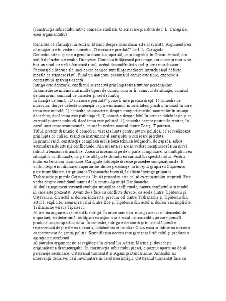 Copy Of Comedia Construcţia Subiectului Intr O Comedie Studiată O Scrisoare Pierdută De I L Caragiale Eseu Argumentativ
