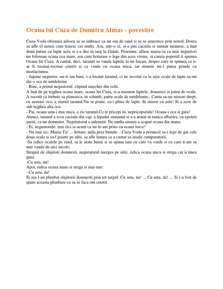 Ocaua Lui Cuza Povestire Populara Anideșcoală Ro