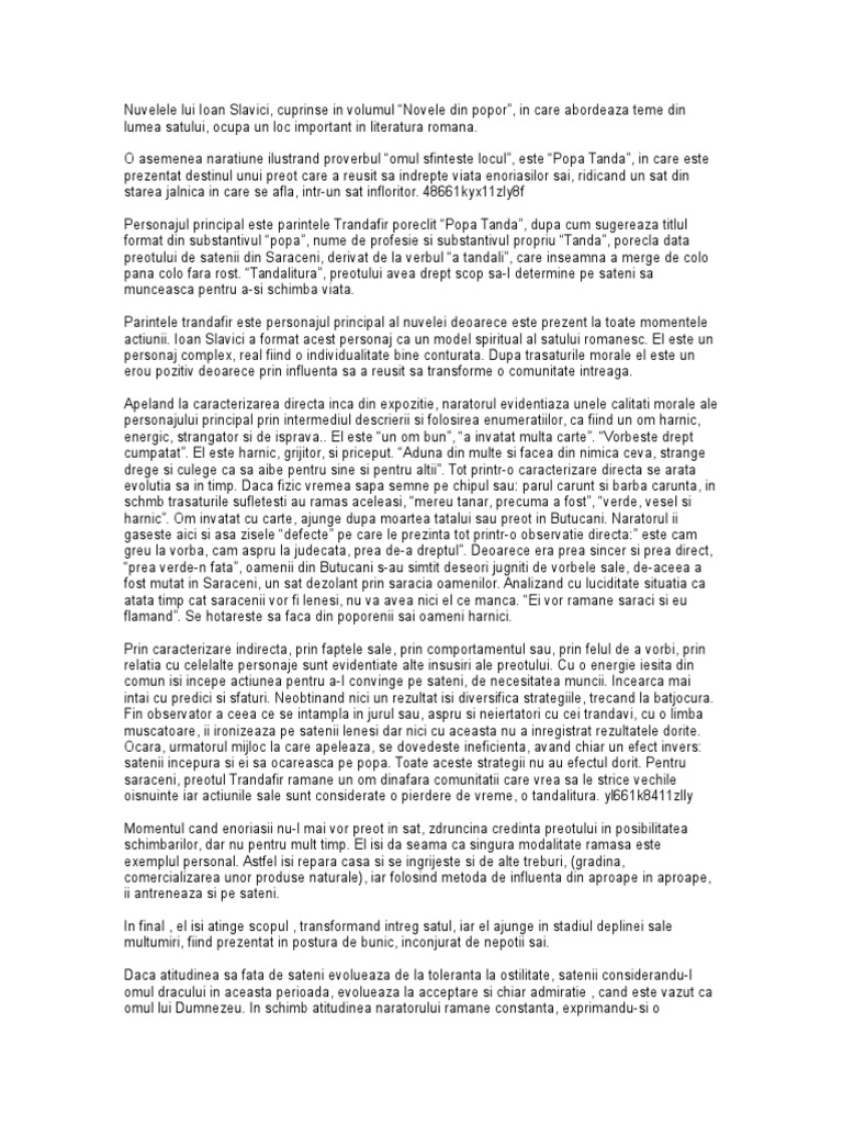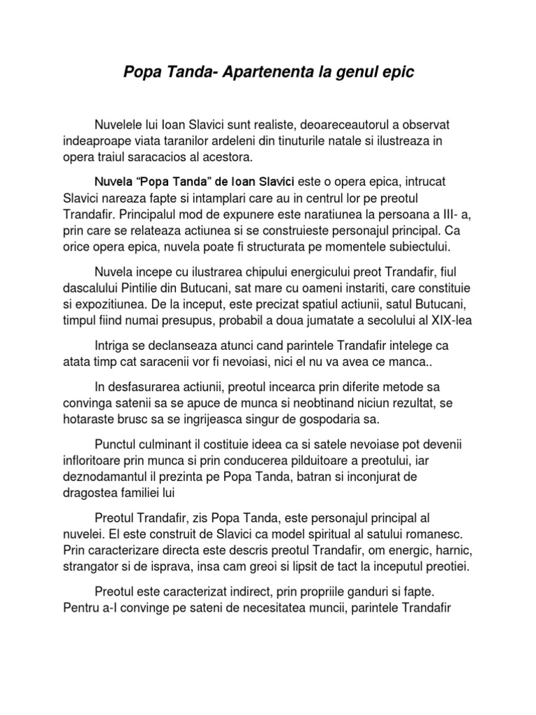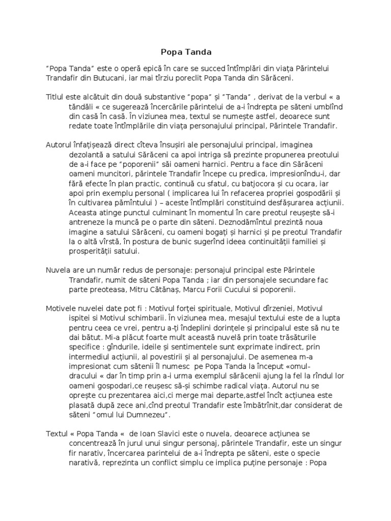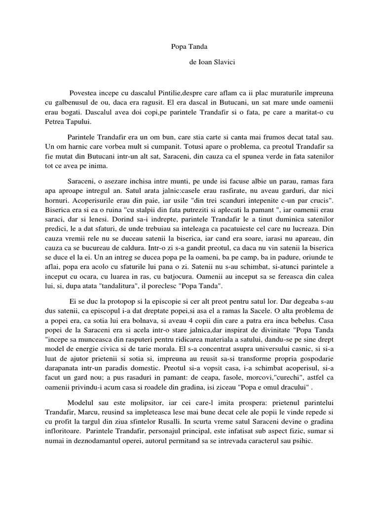 Personajele din popa tanda. In imprumut nu putea lua fiindca se afla in saraceni unde nici popa n avea lese cumsecade. Lumea aparte a nuvelei popa tanda de ioan slavici este evocata si prin intermediul personajelor care o populeaza si o reprezinta. Parintele trandafir este personajul principal al nuvelei fiind prezent in toate momentele actiunii si infatisat in evolutia sa in vremea asta parintele trandafir a imbatranit cu zece ani. Popa tanda caracterizarea personajului naratiunea popa tanda de ioan slavici are toate trasaturile unei nuvele.